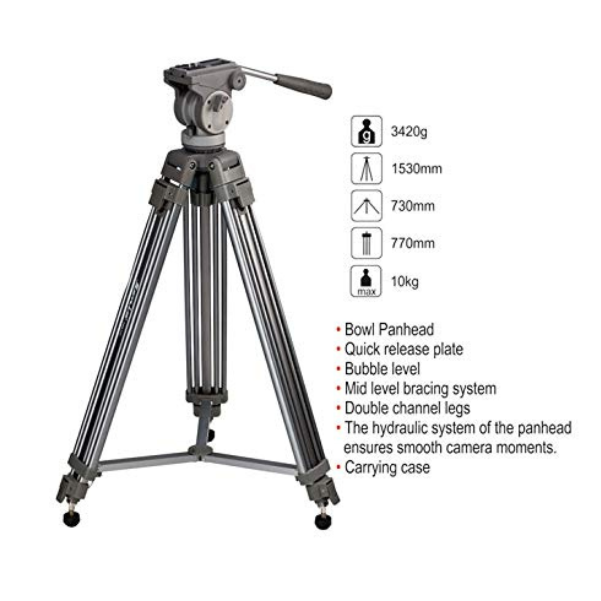 Constructed from high-grade aluminium alloy, the tripod offers a solid and durable build while maintaining a manageable weight of 3.42 kg. With a maximum height of 1530mm and a folded height of 770mm, it’s both versatile and travel-friendly.